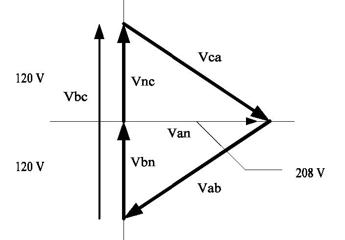 相的相-地電壓則等于208V。三相四線三角形接法的電壓相位圖見圖C.5。